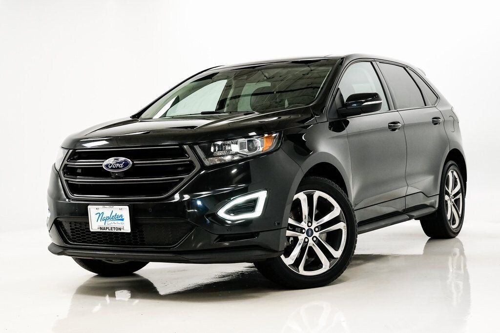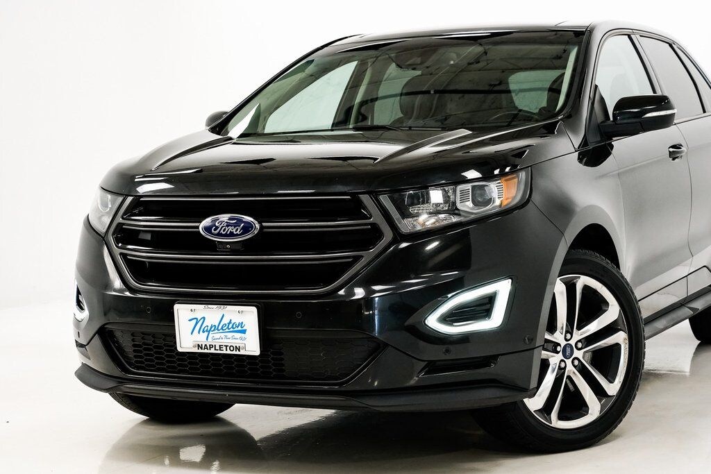 This Edge is well equipped with Equipment Group 401A (Enhanced Active Park Assist System, Hands-Free Liftgate, Lane Keeping Assist, Front 180 Degree Camera, Heated Rear-Seats, Heated/Cooled Front Seats, HID Headlamps w/Auto High Beams, and Rain Sensing Windshield Wipers), Technology Package (BLIS Blind Spot Information System, Auto-Dimming Driver's Sideview Mirror, Integrated SiriusXM Traffic & Travel Link, Power Converter 110V Outlet, Radio: AM/FM Stereo w/Single CD/Navigation, Remote Start System, and SiriusXM Radio), Heated front seats, Panoramic Vista Roof, 12 Speakers, 3.39 Axle Ratio, 4-Wheel Disc Brakes, ABS brakes, Air Conditioning, Alloy wheels, AM/FM radio: SiriusXM, AM/FM Stereo w/Single CD Player, Auto-dimming Rear-View mirror, Automatic temperature control, Brake assist, Bumpers: body-color, CD player, Compass, Delay-off headlights, Driver door bin, Driver vanity mirror, Dual front impact airbags, Dual front side impact airbags, Electronic Stability Control, Emergency communication system, Exterior Parking Camera Rear, Four wheel independent suspension, Front anti-roll bar, Front Bucket Seats, Front Center Armrest w/Storage, Front dual zone A/C, Front reading lights, Fully automatic headlights, Garage door transmitter, Heated door mirrors, Illuminated entry, Knee airbag, Leather Shift Knob, Low tire pressure warning, Memory seat, Occupant sensing airbag, Outside temperature display, Overhead airbag, Overhead console, Panic alarm, Passenger door bin, Passenger vanity mirror, Perforated Leather-Trimmed Heated Sport Seats, Power door mirrors, Power driver seat, Power passenger seat, Power steering, Power windows, Premium audio system: Sony, Rear anti-roll bar, Rear Parking Sensors, Rear reading lights, Rear seat center armrest, Rear window defroster, Rear window wiper, Remote keyless entry, Security system, Speed control, Speed-Sensitive Wipers, Split folding rear seat, Spoiler, Steering wheel mounted audio controls, SYNC w/MyFord Touch, Tachometer, Telescoping steering wheel, Tilt steering wheel, Traction control, Trip computer, Turn signal indicator mirrors, Variably intermittent wipers, and Wheels: 20" Polished w/Magn Low Gloss Ptd Pockets.