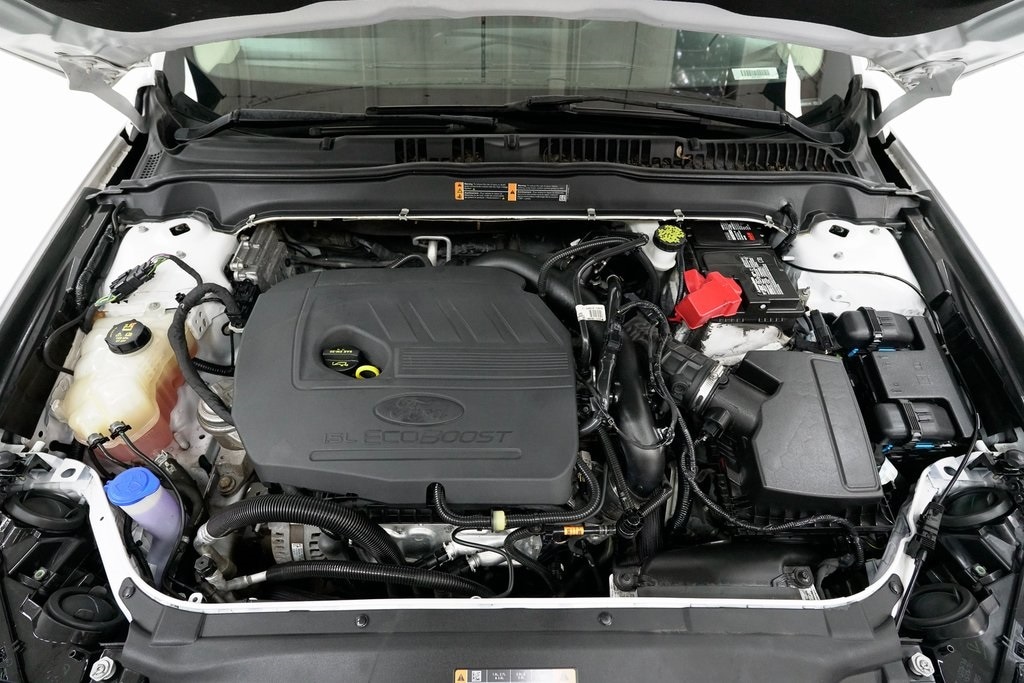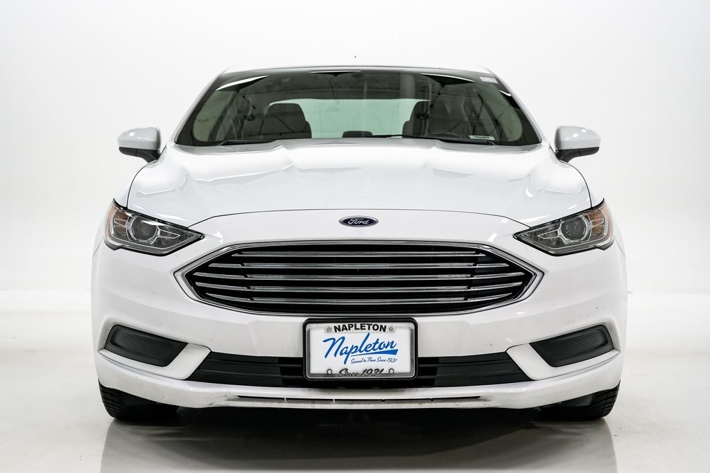 This Fusion is well equipped with Equipment Group 200A, Fusion SE Cold Weather Package (Heated Front Seats, All-Weather Front & Rear Floor Mats, and Upgraded Sideview Mirrors - Heated), 6-Speed Automatic, Exterior Parking Camera Rear, Power door mirrors, Remote keyless entry, SYNC Communications & Entertainment System, Wheels: 17" Sparkle Silver Painted Aluminum, 4-Wheel Disc Brakes, 6 Speakers, ABS brakes, Air Conditioning, Alloy wheels, AM/FM radio: SiriusXM, Brake assist, Bumpers: body-color, CD player, Cloth Front Bucket Seats, Compass, Delay-off headlights, Driver door bin, Driver vanity mirror, Dual front impact airbags, Dual front side impact airbags, Electronic Stability Control, Emergency communication system: 911 Assist, Four wheel independent suspension, Front anti-roll bar, Front Bucket Seats, Front Center Armrest, Front reading lights, Fully automatic headlights, Illuminated entry, Knee airbag, Low tire pressure warning, Occupant sensing airbag, Outside temperature display, Overhead airbag, Overhead console, Panic alarm, Passenger door bin, Passenger vanity mirror, Power driver seat, Power passenger seat, Power steering, Power windows, Radio data system, Radio: AM/FM Stereo/MP3/Single-CD, Rear anti-roll bar, Rear reading lights, Rear seat center armrest, Rear window defroster, Security system, SiriusXM Radio, Speed control, Speed-sensing steering, Speed-Sensitive Wipers, Split folding rear seat, Steering wheel mounted audio controls, Tachometer, Telescoping steering wheel, Tilt steering wheel, Traction control, Trip computer, and Variably intermittent wipers.