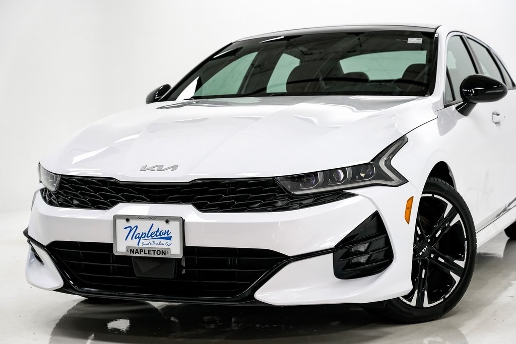 This K5 is well equipped with GT-Line Panoramic Sunroof Package (Panoramic Sunroof, Gloss Black Pillar & Door Frame Cover, and LED Interior Lighting), GT-Line Premium Package (Forward Collision Avoidance-Assist, Smart Cruise Control w/Stop & Go, Highway Driving Assist, and LED Projection Headlamps), GT-Line Red Interior Package, Apple CarPlay & Android Auto, Front dual zone A/C, Heated Front Bucket Seats, Heated steering wheel, Wheels: 18" Gloss Black Machined Finish Alloy, 4-Wheel Disc Brakes, 6 Speakers, ABS brakes, Air Conditioning, Alloy wheels, AM/FM radio: SiriusXM, Auto High-beam Headlights, Automatic temperature control, Brake assist, Bumpers: body-color, Carpeted Floor Mats, Cloth/SynTex Seat Trim, Delay-off headlights, Driver door bin, Driver vanity mirror, Dual front impact airbags, Dual front side impact airbags, Electronic Stability Control, Four wheel independent suspension, Front anti-roll bar, Front Bucket Seats, Front Center Armrest, Front fog lights, Front reading lights, Fully automatic headlights, Heated door mirrors, Heated front seats, Illuminated entry, Knee airbag, Low tire pressure warning, Navigation System, Occupant sensing airbag, Outside temperature display, Overhead airbag, Overhead console, Panic alarm, Passenger door bin, Passenger vanity mirror, Power door mirrors, Power driver seat, Power steering, Power windows, Radio data system, Radio: AM/FM/MP3 Audio System, Rear anti-roll bar, Rear seat center armrest, Rear side impact airbag, Rear window defroster, Remote keyless entry, Security system, Speed control, Speed-sensing steering, Split folding rear seat, Spoiler, Sport steering wheel, Steering wheel mounted audio controls, Tachometer, Telescoping steering wheel, Tilt steering wheel, Traction control, Trip computer, Turn signal indicator mirrors, and Variably intermittent wipers.