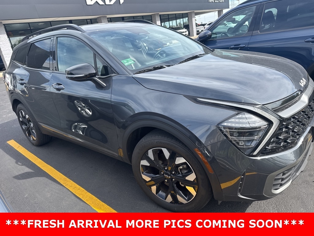 This Sportage is well equipped with AWD, 4-Wheel Disc Brakes, 6 Speakers, ABS brakes, Air Conditioning, Alloy wheels, AM/FM radio: SiriusXM, Apple CarPlay & Android Auto, Auto High-beam Headlights, Automatic temperature control, Axle Ratio: 3.648, Brake assist, Bumpers: body-color, Carpet Floor Mats X-Line, Compass, Delay-off headlights, Driver door bin, Driver vanity mirror, Dual front impact airbags, Dual front side impact airbags, Electronic Stability Control, Emergency communication system, Four wheel independent suspension, Front anti-roll bar, Front Bucket Seats, Front Center Armrest, Front dual zone A/C, Fully automatic headlights, Heated door mirrors, Heated Front Bucket Seats, Heated front seats, Illuminated entry, Leather steering wheel, Low tire pressure warning, Navigation System, Occupant sensing airbag, Outside temperature display, Overhead airbag, Overhead console, Panic alarm, Passenger door bin, Passenger vanity mirror, Power door mirrors, Power driver seat, Power steering, Power windows, Premium Leatherette Seat Trim, Radio: AM/FM/HD Audio System, Rain sensing wipers, Rear anti-roll bar, Rear seat center armrest, Rear side impact airbag, Rear window defroster, Rear window wiper, Remote keyless entry, Security system, Speed control, Speed-sensing steering, Split folding rear seat, Spoiler, Steering wheel mounted audio controls, Tachometer, Telescoping steering wheel, Tilt steering wheel, Traction control, Trip computer, Turn signal indicator mirrors, Variably intermittent wipers, and Wheels: 19" Gloss Black Alloy.